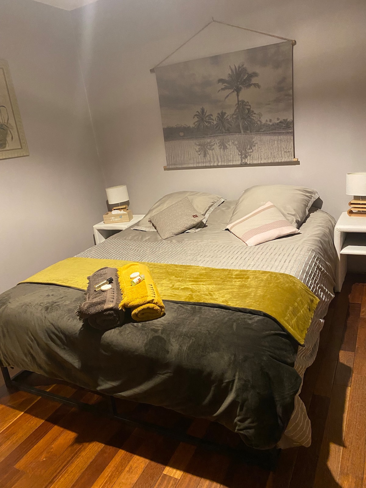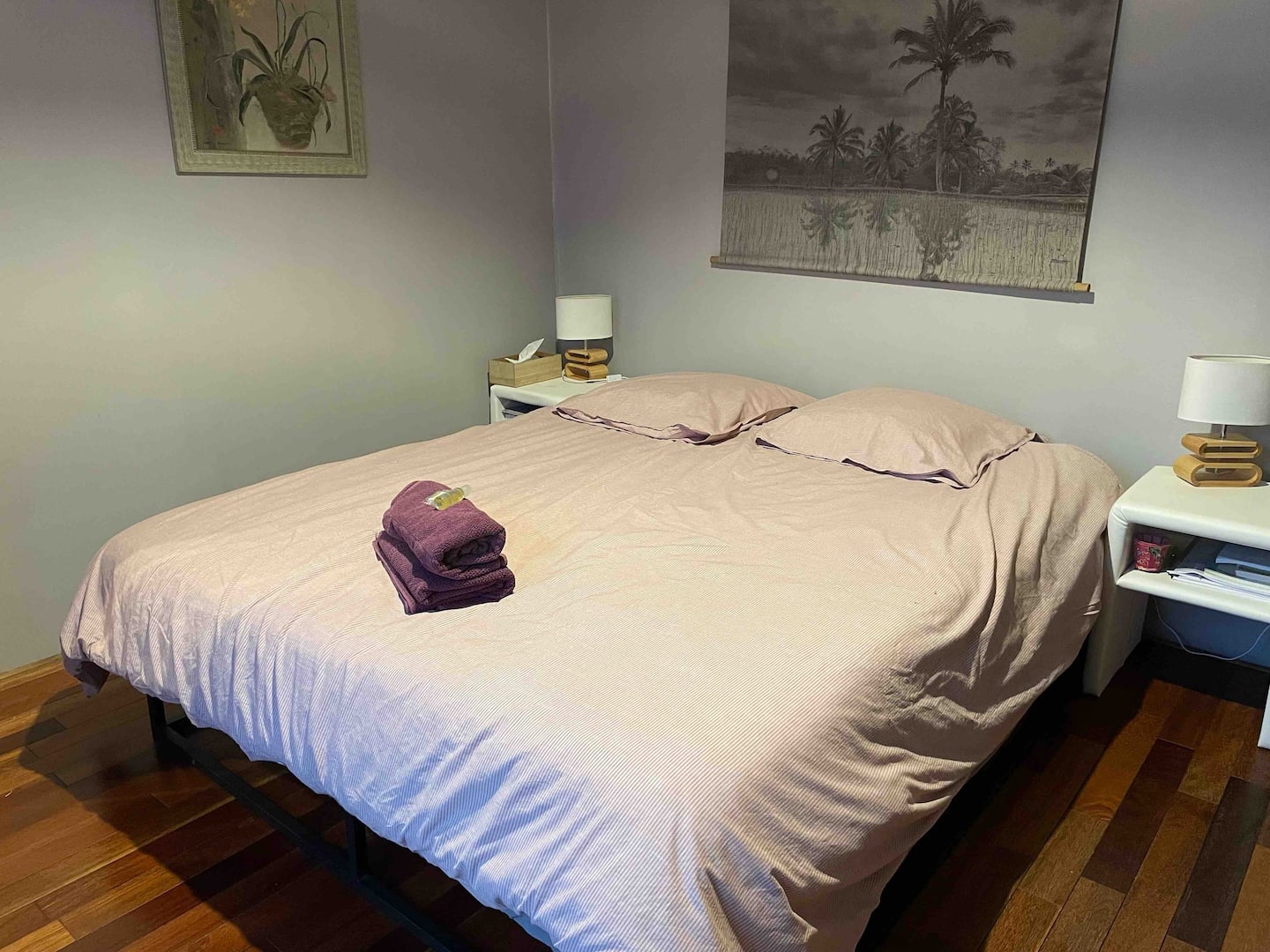 Chambre agréable avec accès terrasse jardin et piscine. Salle de bain à partager à côté de la chambre. Petit salon détente possible avec télévision. Vous aurez l’accès cuisine pour préparer vos repas et une place réservée dans un réfrigérateur pour conserver vos denrées. Cette chambre n’a pas pour l’instant de télévision mais accès wifi.