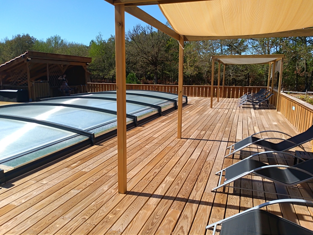 Le Domaine de Sophie dispose de 6 chalets en bois, décorés, meublés avec soin et avec tout le confort nécessaire pour passer un bon séjour. Situé sur un terrain de 2 hectares, les chalets sont composés d’une pièce à vivre avec cuisine équipée, 2 chambres (1 lit 140 et 2 lits 90 superposés), une salle d’eau, un WC séparé. Climatisation réversible. Vous pourrez profiter d’une terrasse ensoleillée avec tout l’équipement nécessaire pour profiter d’un moment de détente à la campagne. Draps, linge de toilette et linge de cuisine inclus. Les animaux de la ferme vous accueilleront durant votre séjour sur le domaine.