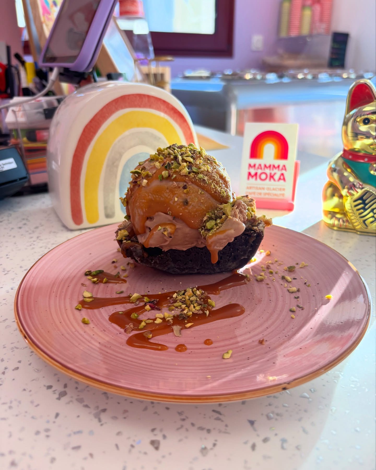 Mamma Moka propose une carte inspirée à la fois de l’Italie et de l’Amérique du Nord, avec une variété de gourmandises : brownies, cookies, tartes, et cakes, accompagnés de cafés et thés. Vous y trouverez également des cafés frappés, des thés glacés aux fruits frais, ainsi que des boissons à base de glace, avec un choix de sorbets d’inspiration italienne.